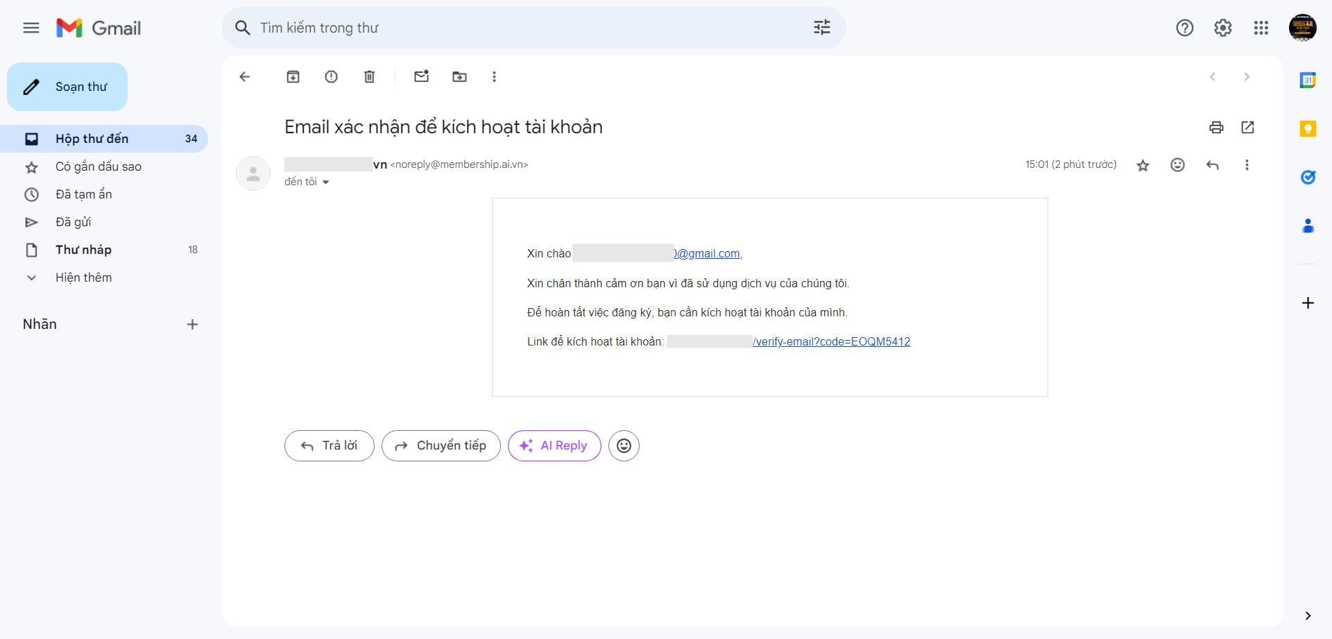 Sau khi nhận thông báo đăng ký thành công, hãy kiểm tra hộp thư Gmail của bạn để thực hiện bước bước xác thực tài khoản bằng cách nhấp vào link kích hoạt tài khoản trong email đã gửi.