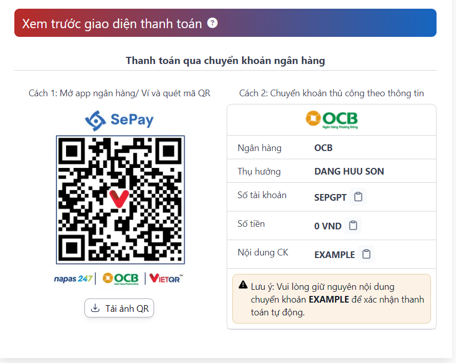Khách hàng sẽ thanh toán trực tiếp vào tài khoản ngân hàng cá nhân của bạn. Bạn cần xử lý đơn hàng thủ công theo quy trình sau: