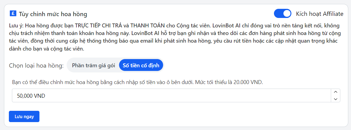 Số tiền hoa hồng tuyệt đối: Nhập số tiền cụ thể cho mỗi giao dịch thành công.