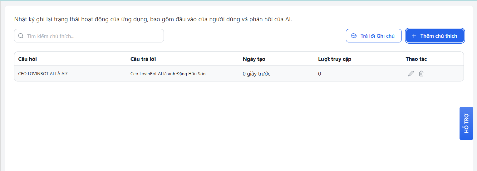 Phần Ghi chú trong Lovinbot cho phép lưu trữ những câu trả lời có sẵn từ tài liệu. Điều này giúp Chatbot AI truy xuất dữ liệu một cách hiệu quả theo quy trình như sau: