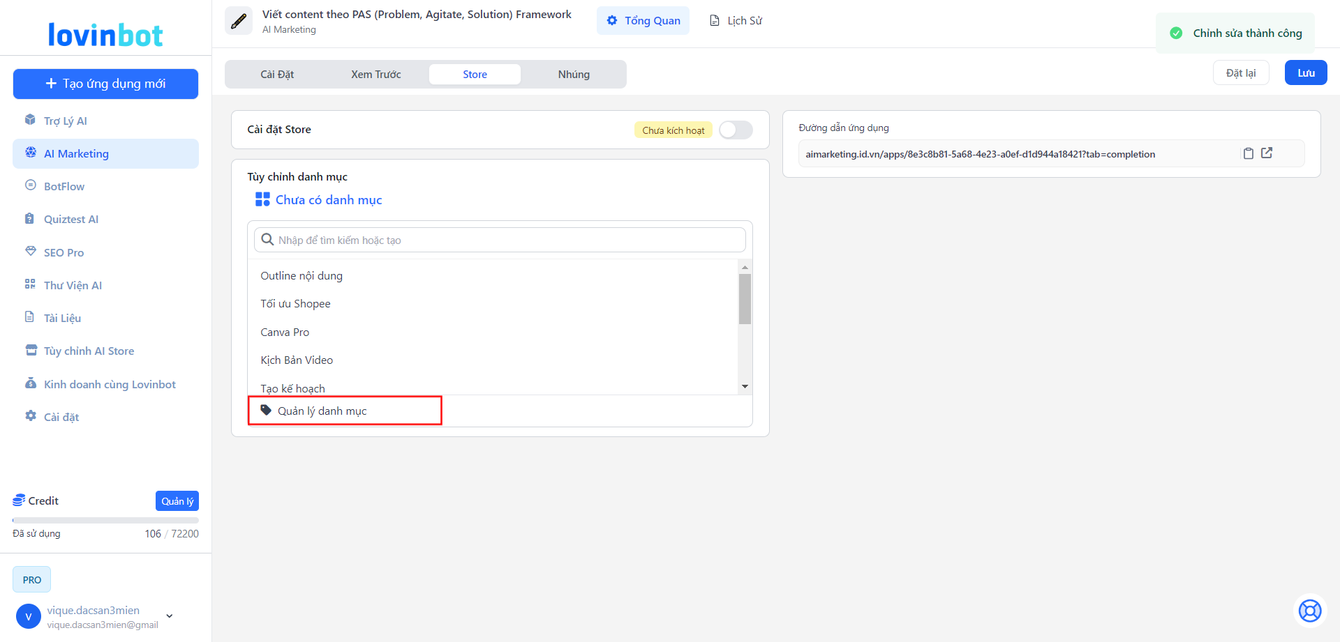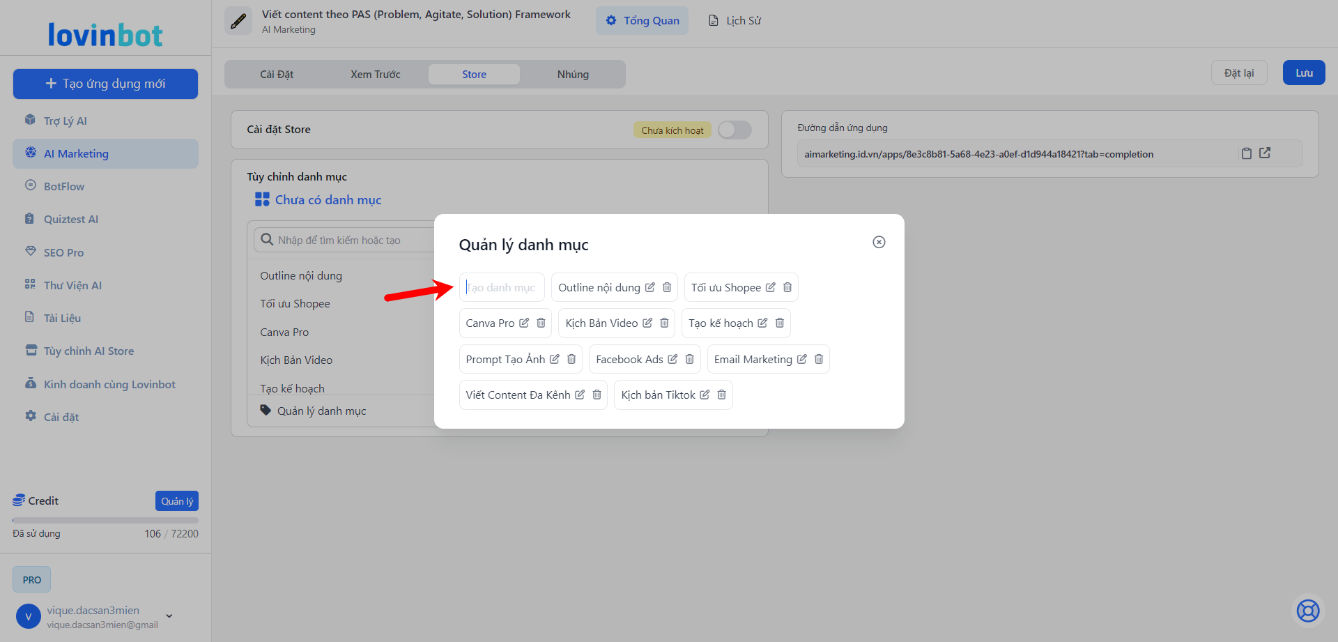 Phần Cửa hàng trong Lovinbot là nơi hiển thị Chatbot AI lên giao diện cửa hàng của bạn theo domain hoặc subdomain mà bạn đã lựa chọn trong phần cài đặt. Điều này cho phép khách hàng dễ dàng tương tác
