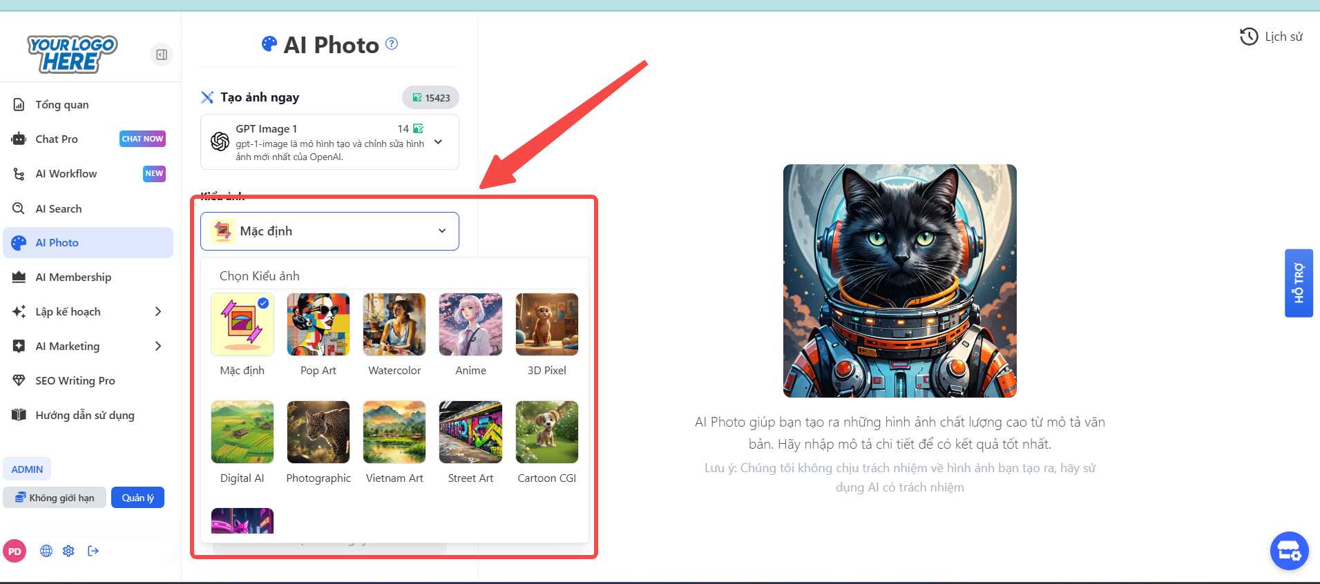 Nhấn vào menu thả xuống để xem danh sách các phong cách có sẵn như: Pop Art, Watercolor (Màu nước), Anime, Digital Art, Photographic (Nhiếp ảnh), Street Art (Nghệ thuật đường phố),...