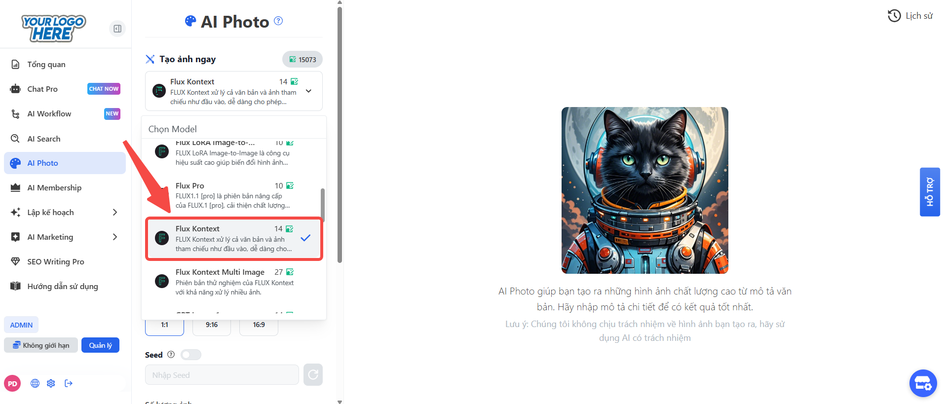 Trong giao diện chính của AI Photo, tại mục "Tạo ảnh ngay", nhấn vào menu thả xuống để lựa chọn mô hình và chọn "Flux Kontekst".