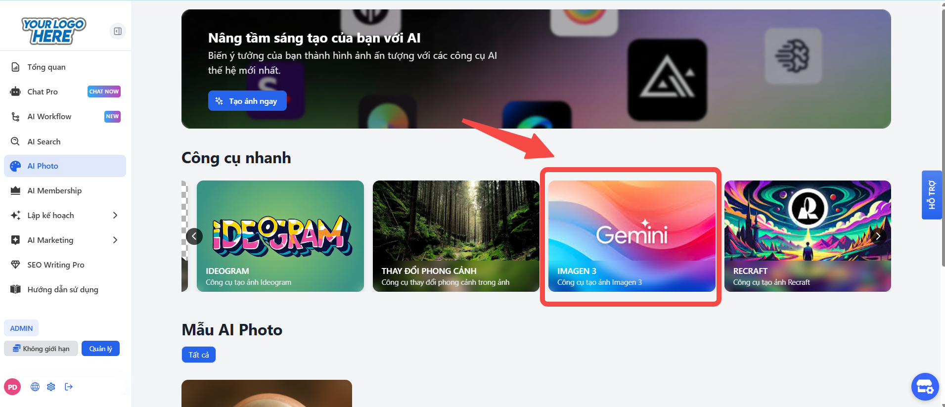 Từ giao diện chính của hệ thống, điều hướng đến mục AI Photo trên thanh menu bên trái. Tại đây, trong khu vực "Công cụ nhanh", hãy chọn công cụ "IMAGEN 3" để bắt đầu.