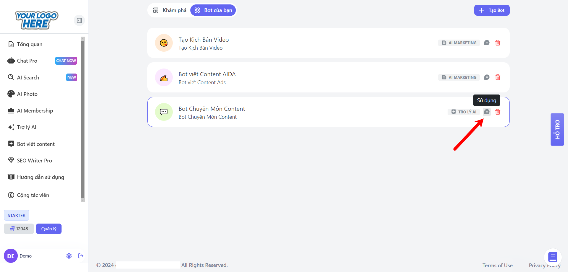 Lựa chọn mẫu ChatBot đã tạo và bắt đầu sử dụng.