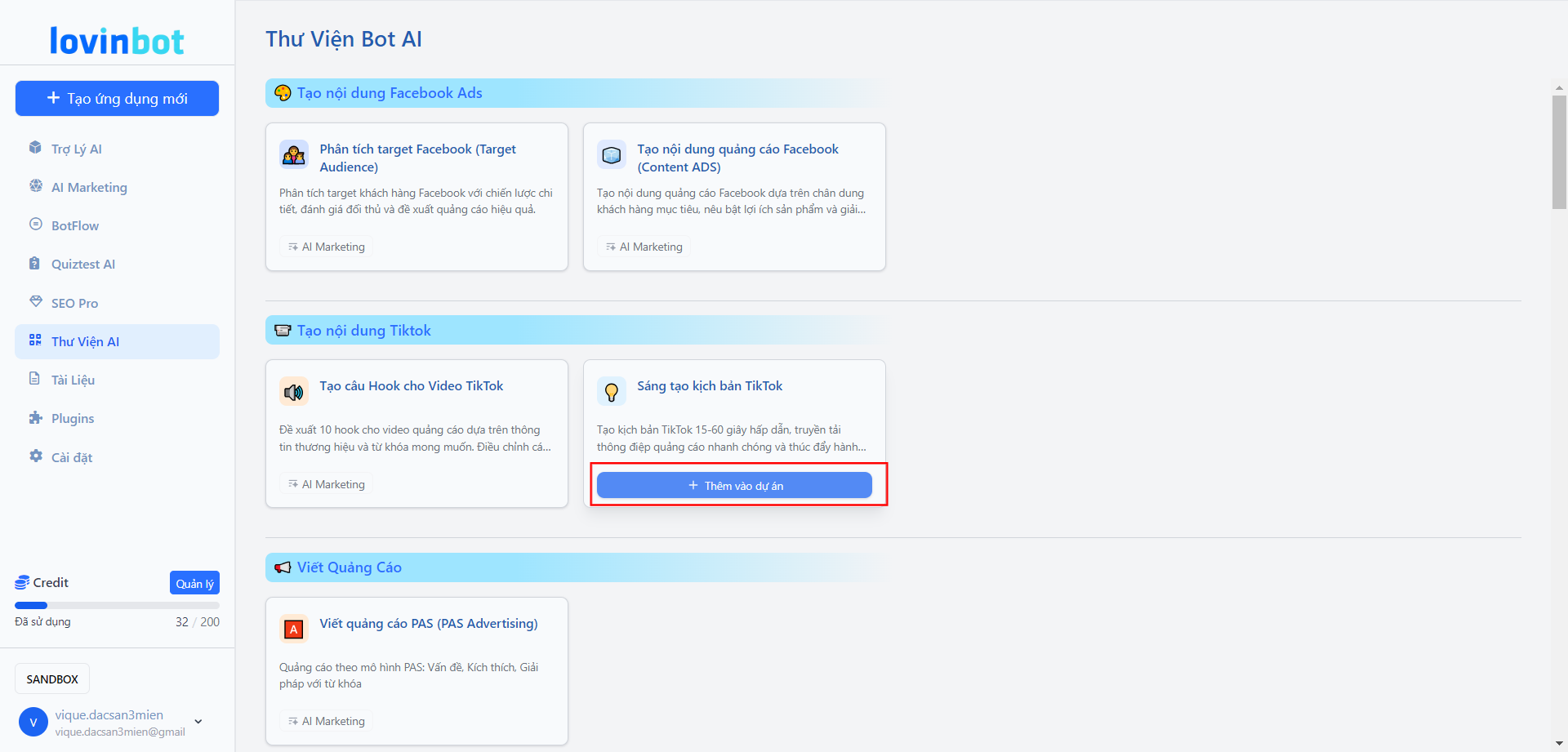 Truy cập ngay Thư viện AI -> Chọn mẫu phù hợp -> Chọn +Thêm vào dự án