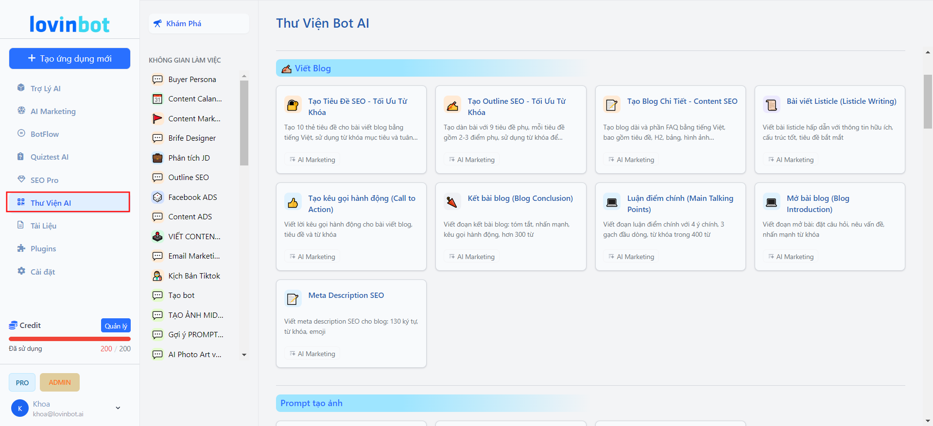 Prompt Template là bộ sưu tập các mẫu hướng dẫn đã được tối ưu hóa, giúp bạn nhanh chóng tạo ra nội dung chất lượng cao cho nhiều mục đích khác nhau. Dưới đây là cách truy cập và sử dụng các Prompt Template trên Lovinbot.