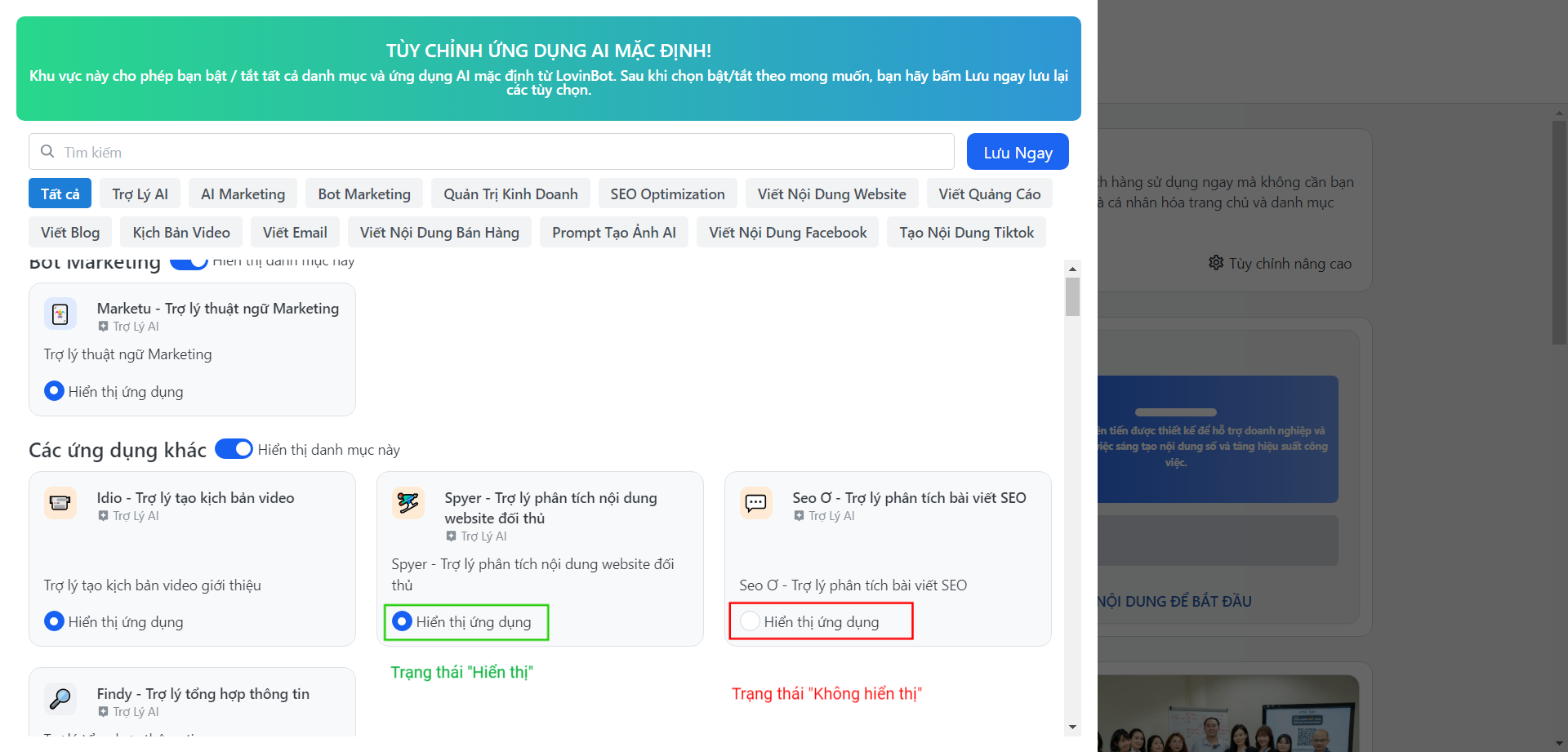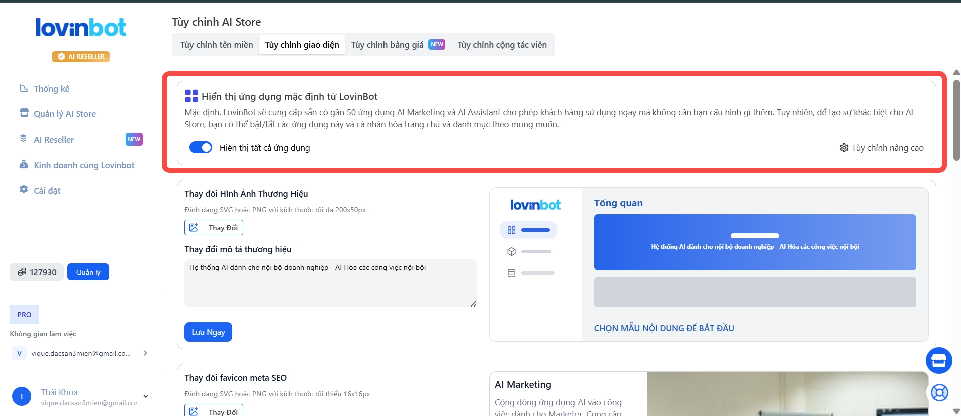 Truy cập vào LovinBot.ai -> Đăng nhập tài khoản LovinBot -> Chọn "Tùy chỉnh AI Store" -> Chọn "Tùy chỉnh giao diện" -> Thao tác tại: Hiển thị ứng dụng mặc định từ LovinBot