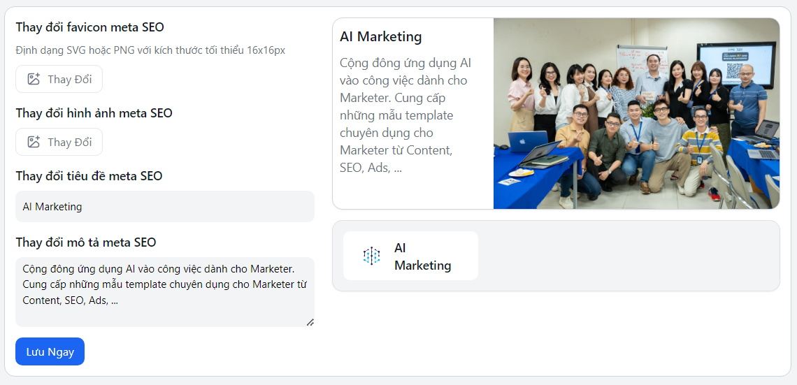 Truy cập vào LovinBot.ai -> Đăng nhập tài khoản LovinBot -> Chọn "Tùy chỉnh AI Store" -> Chọn "Tùy chỉnh giao diện" -> Điều chỉnh: Thay đổi favicon meta SEO