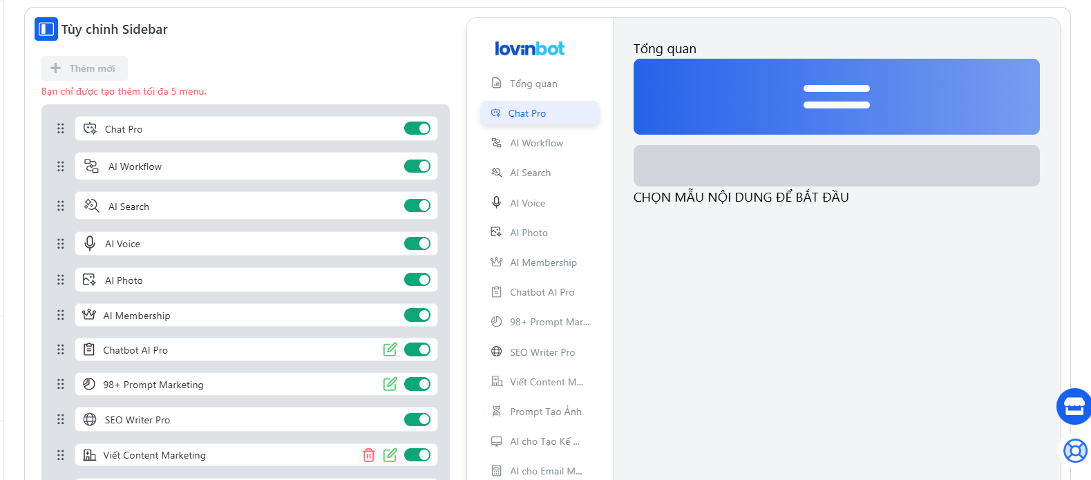 Truy cập vào LovinBot.ai -> Đăng nhập tài khoản LovinBot -> Chọn "Tùy chỉnh AI Store" -> Chọn "Tùy chỉnh giao diện" -> Điều chỉnh: Tùy chỉnh Sidebar