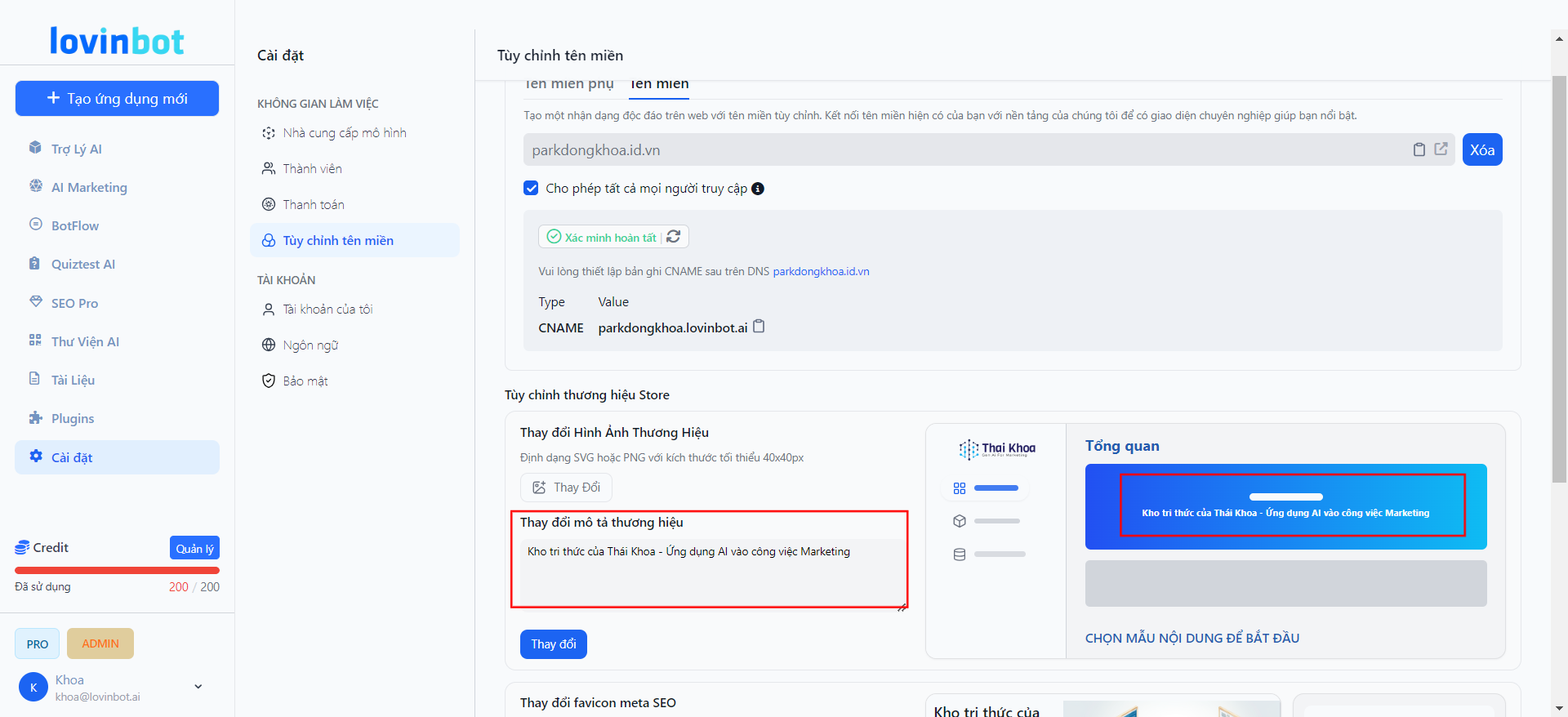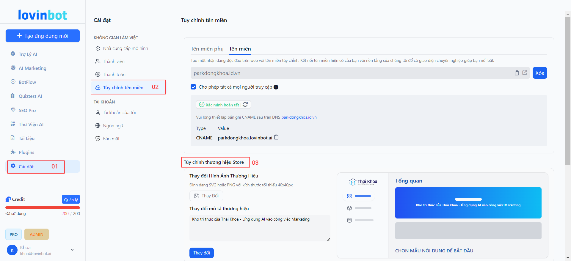 Truy cập: Cài đặt -> Tùy chỉnh tên miền -> Tùy chỉnh thương hiệu Store