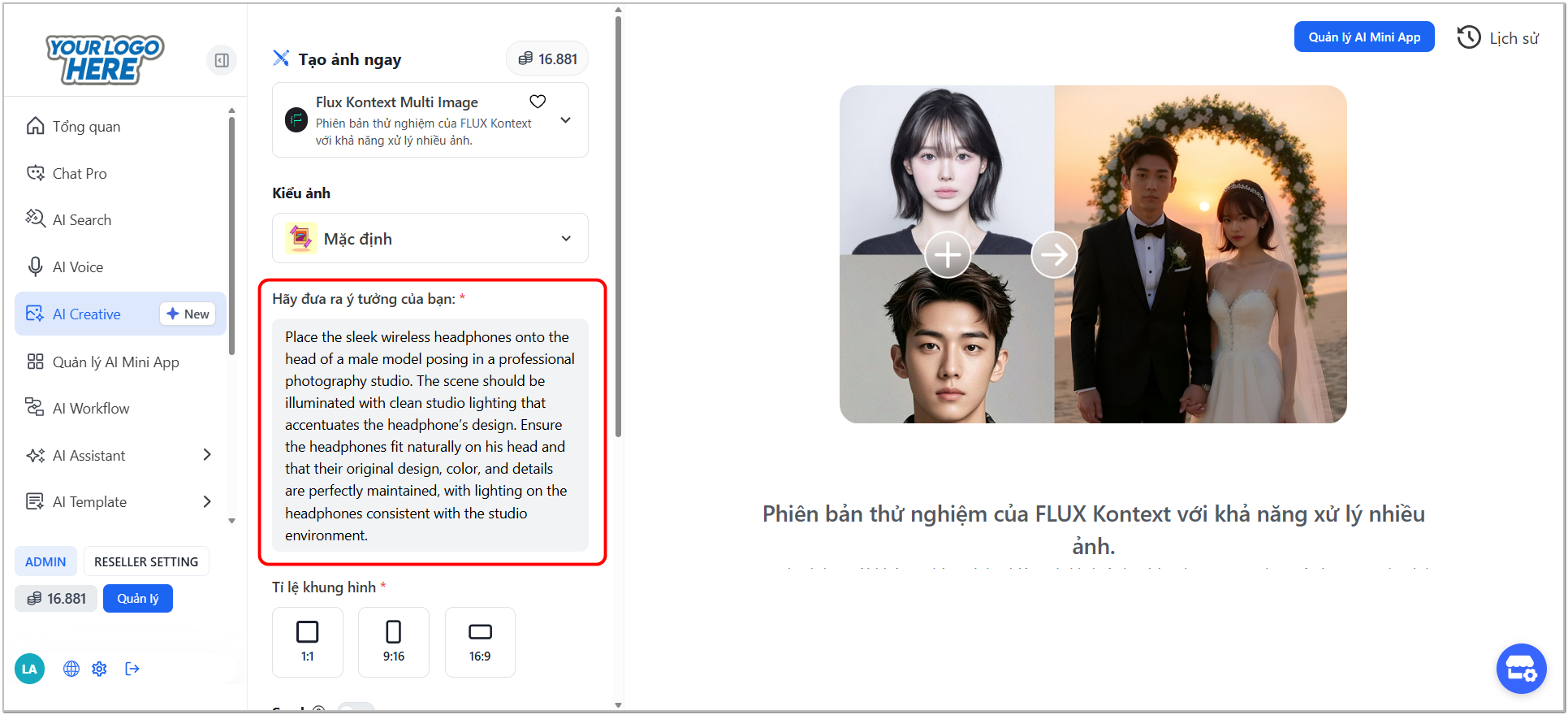 Trong giao diện chính của **AI Creative**, chọn cửa sổ model, chọn  **"Tạo ảnh"** và chọn mô hình **"Flux Kontext Multi Image".**